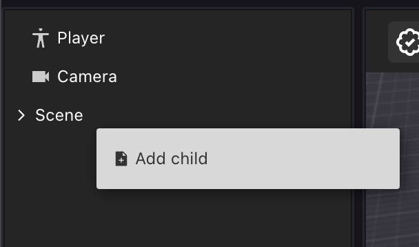 To create a fresh new Entity, right click on the root Scene Entity in the Entity tree, or on any other Entity, and select Add Child