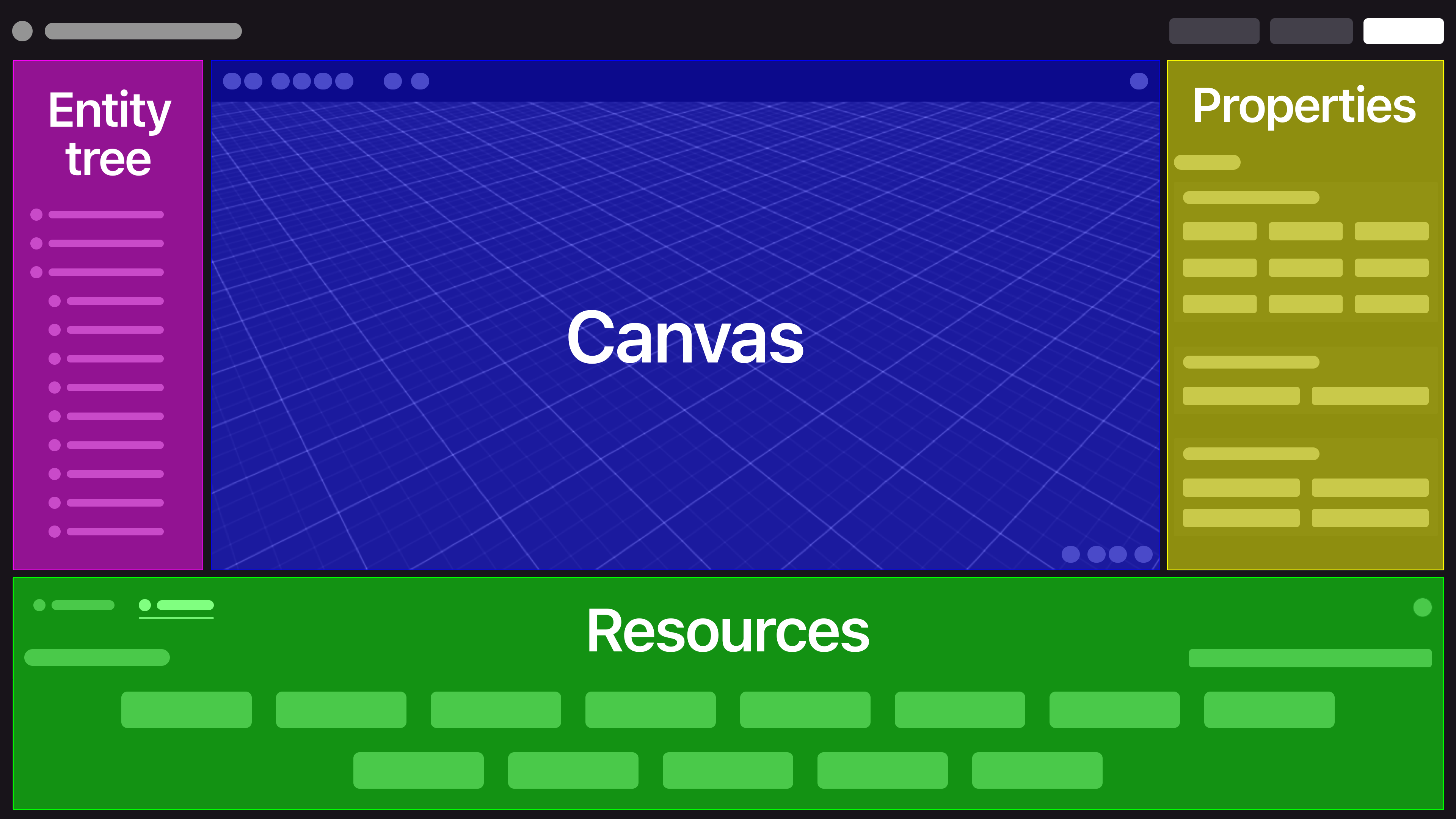 - Entity tree: Contains a list of all items in the scene and their hierarchy.