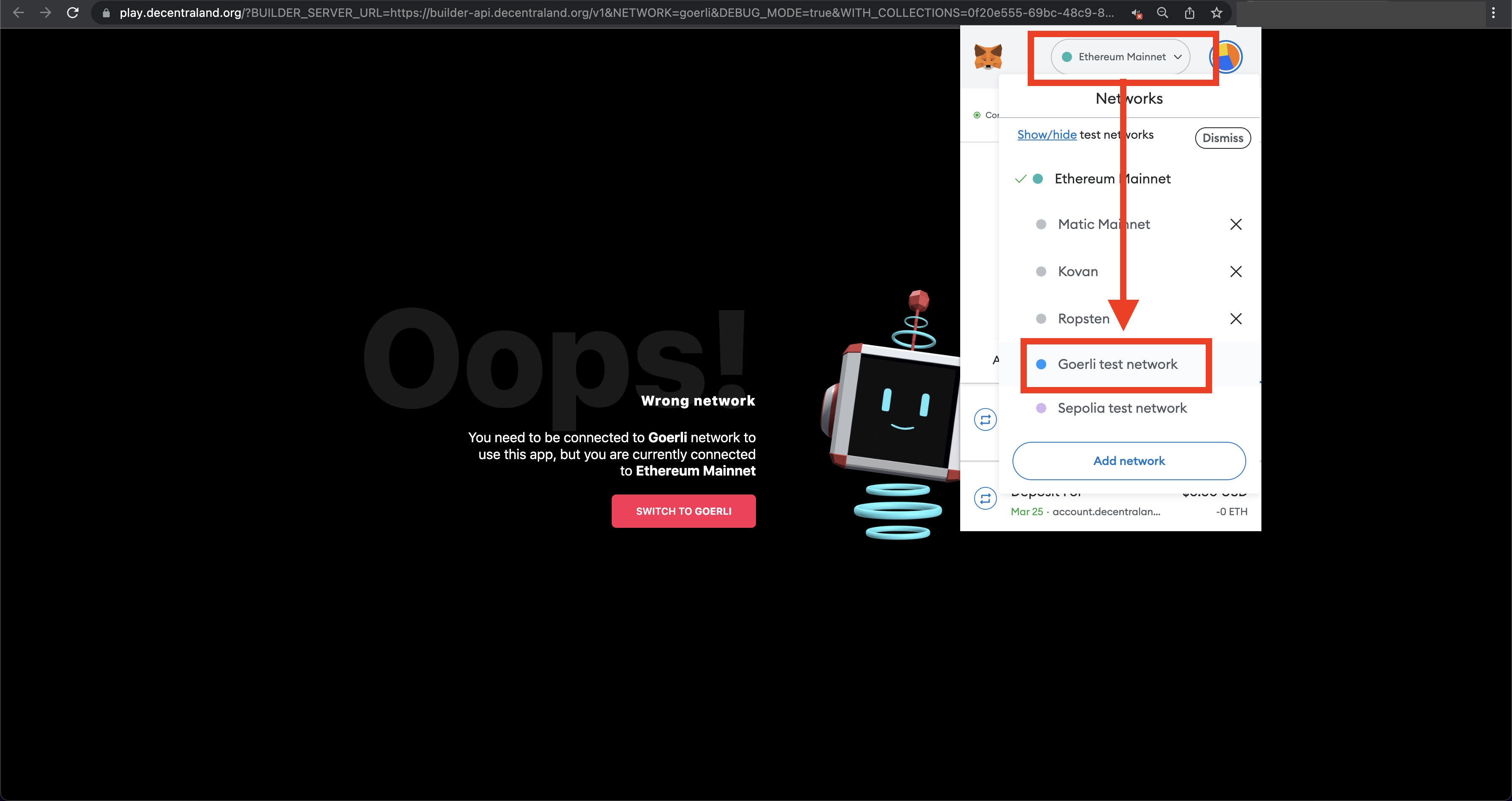 Click on Switch to Sepolia and a popup from your wallet will show up asking to switch the network. Simply click on Switch Network and the new tab will automatically refresh. To test your wearable, go to the backpack and select it.