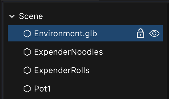 Entities follow a hierarchy that can have as many levels as you want. Establish a parent-child relationship between two entities by dragging one item onto another on the tree. A child entity inherits the position of the parent, so when the parent moves, it carries any children with it. This can be practical while building a scene, for example you can set glasses and plates as children of a table, and then move the table without needing to readjust anything else. It can also be important when interacting with the scene, for items to move together.